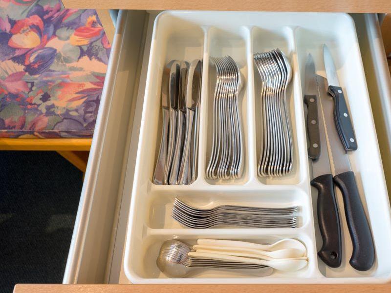 Auf 43 qm stehen Ihnen eine Wohnküche mit moderner Küchenzeile, Sitzecke für 8 Personen, zwei Schlafzimmer mit 2 bzw. 3 Betten, TV, Radio, WLAN und ein Bad mit Doppelwaschbecken, Dusche und WC und 1 extra - WC zur Verfügung.